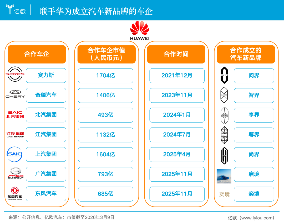 截至2026年3月,与华为联手推出新品牌的车企,已扩容至7家。它们是:赛力斯(问界)、奇瑞(智界)、北汽(享界)、江淮(尊界)、上汽(尚界)、广汽(启境)、东风(奕境)证券配资导航。